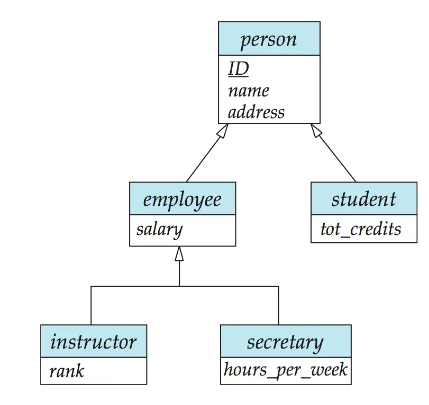 Disjoint指两个实体集的交集为空,即两个实体集没有共同的实体。在第二种表示方法种的employee和student是overlapping的;它们分别由两个箭头指向person,但是instructor和secretary就是disjoint的;它们由一个共同的箭头指向employee.