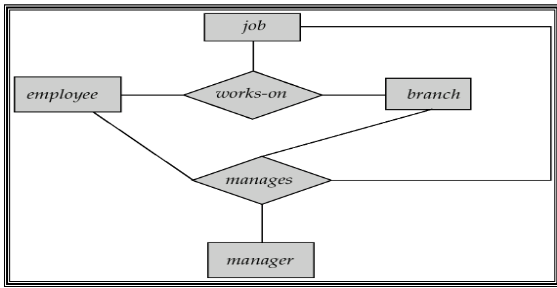 An employee works on a particular job at a particular branch. An employee, branch, job combination may have an associated manager.
