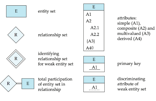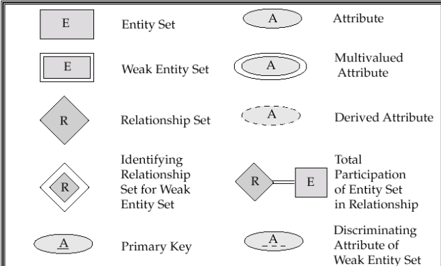 在实体关系模型中,一个没有主键的实体集被称为弱实体集(weak entity set)。弱实体集的存在依赖于一个标识实体集(identifying entity set)的存在。弱实体集必须通过一个从标识实体集到弱实体集的全参与、一对多的关系集(identifying relationship set)与标识实体集关联。标识关系用双菱形表示。