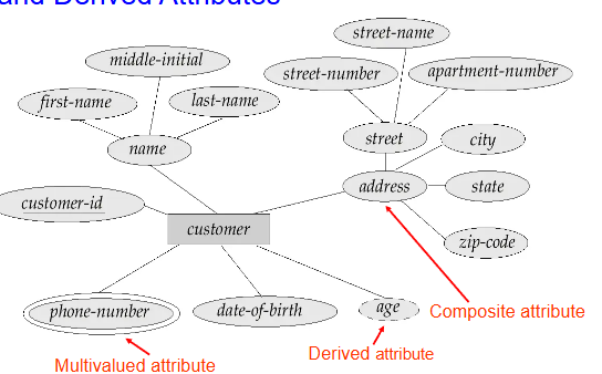 - 复合属性是由多个简单属性组成的属性。它可以分解为更基本的属性。