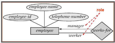 角色(Role):在一个关系中,实体所扮演的功能或角色。例如,在“works-for”关系集中,标签“manager”(经理)和“worker”(工人)就是角色;它们指定了员工实体如何通过“works-for”关系集进行交互。