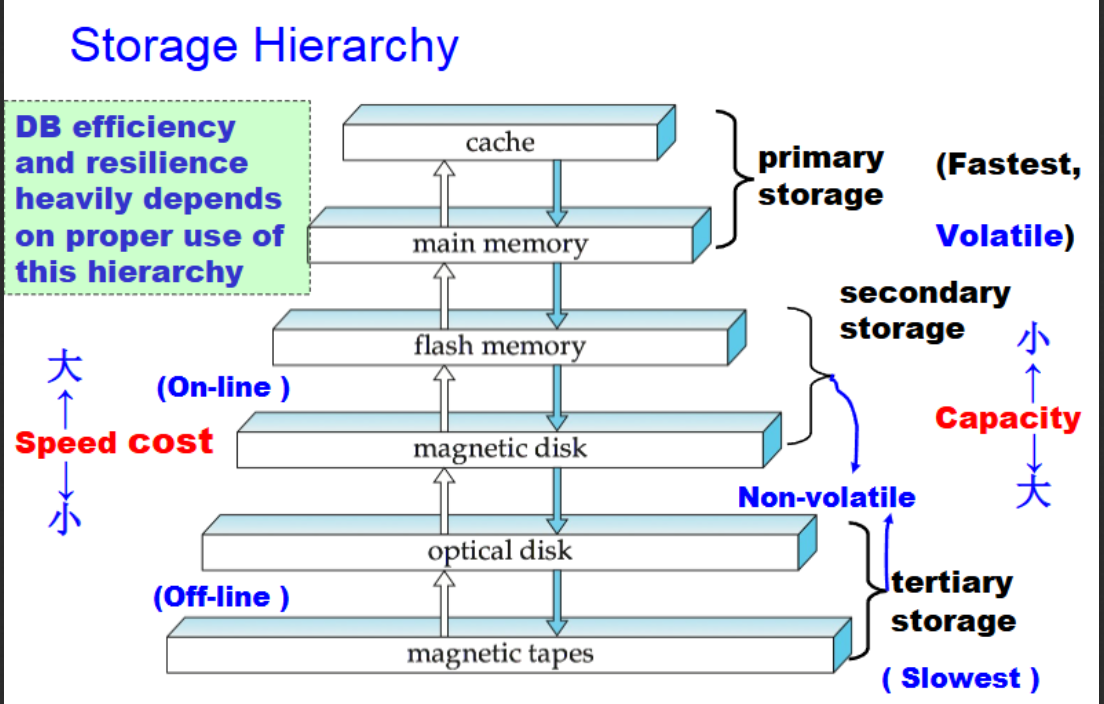 - Non-volatile storage(非易失性存储器): contents persist even when power is switched off. Includes secondary and tertiary storage, as well as batter-backed up main-memory.