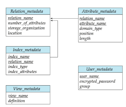 Data dictionary (also called system catalog) stores metadata: that is, data about data, such as: