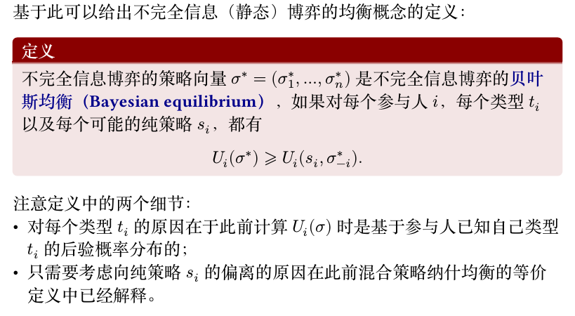 上述表达式中在不完全信息的情况下存在不确定性:参与人不知道其它参与人的类型,因此需要进一步对类型求取期望,得到(将 \(t\) 拆成 \(t_i,t_{-i}\))
