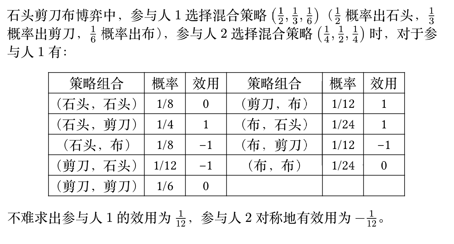 如果你的对手以 ⅓ 的概率随机出剪刀、石头和布: * 你出剪刀的期望收益是:(⅓) * (平局) + (⅓) * (输) + (⅓) * (赢) = 0 (假设赢+1,输-1,平0) * 你出石头的期望收益是:(⅓) * (赢) + (⅓) * (平局) + (⅓) * (输) = 0 * 你出布的期望收益是:(⅓) * (输) + (⅓) * (赢) + (⅓) * (平局) = 0