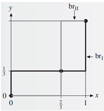 \(x=1,y=0\)(对应纯策略组合(建厂,不进入)),对低成本的参与人 1 而言,\(x=1\) 是 \(y=0\) 的最优反应;对参与人 2,\(x=1\) 时,\(y=0\) 的效用为 0,\(y=1\) 的效用为 \(p-(1-p)=2p-1\),故 \(y=0\) 是 \(x=1\) 的最优反应当且仅当 \(p\leq\frac{1}{2}\);