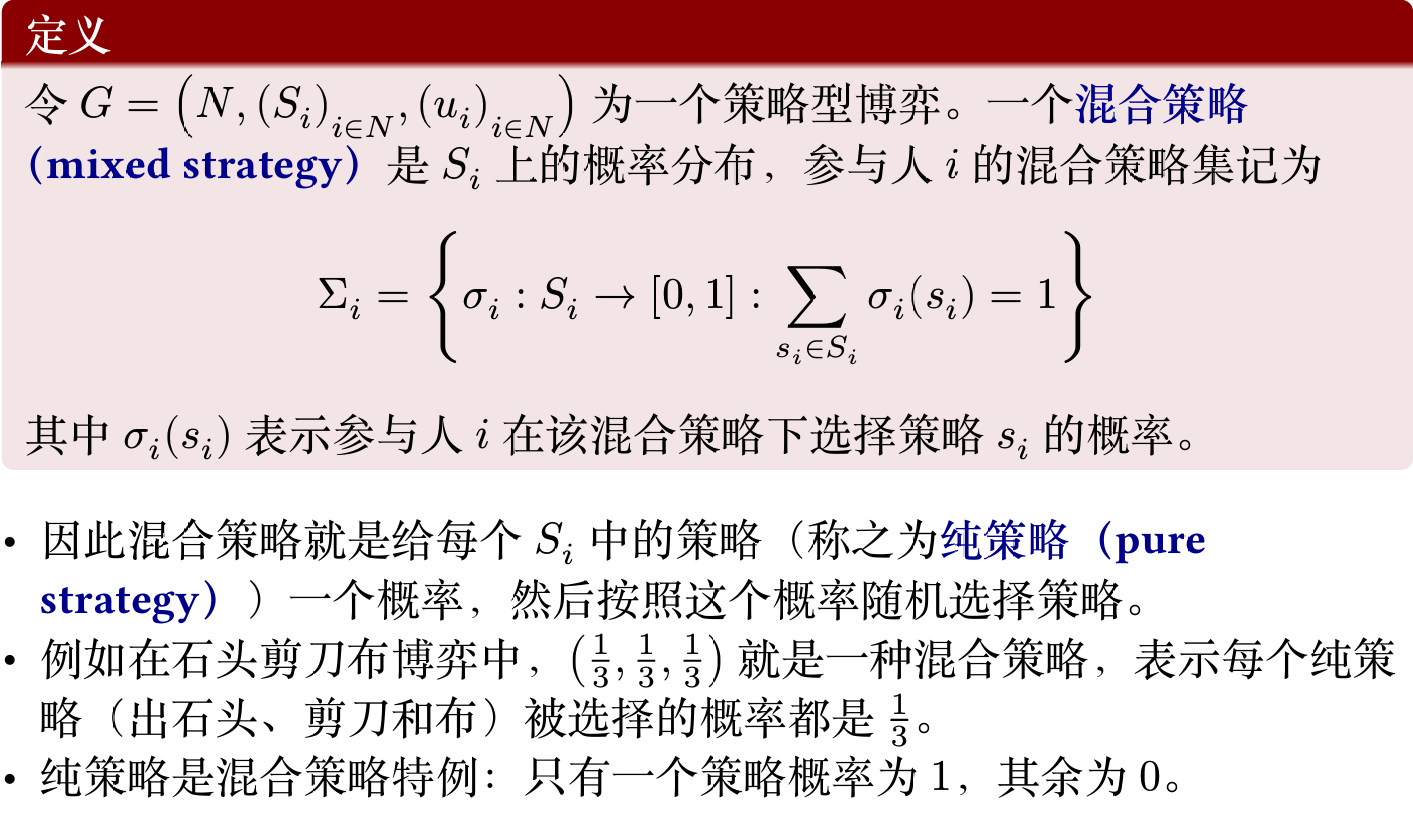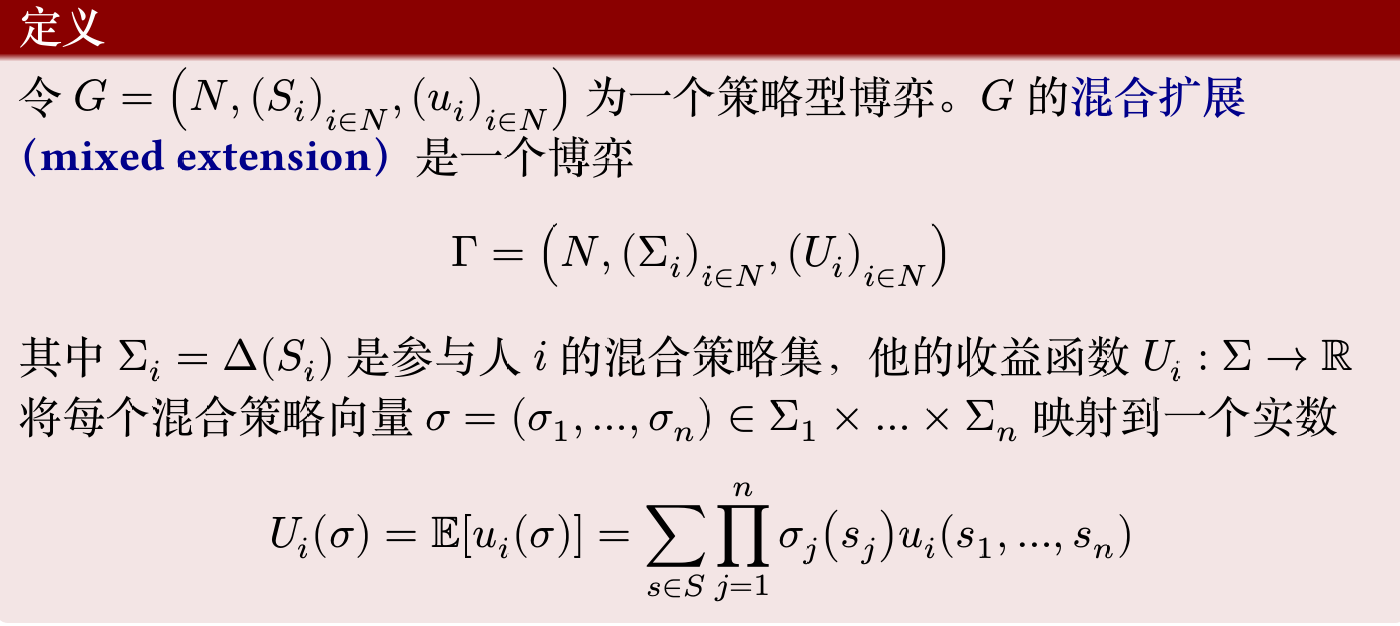 这就得到了参与人策略组合为 \(\sigma=(\sigma_1,\ldots,\sigma_n)\) 时,每个参与人 \(i\) 效用的形式化表达