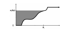 这一支付规则被称为迈尔森支付公式。下图是一个直观解释:横坐标是竞拍者 \(i\) 报价的取值,纵坐标是竞拍者 \(i\) 的分配结果,\(x_i(b_i)\) 所围成的曲线是分配规则,\(x_i(b_i)\) 到纵坐标所围成的面积表示于长方形减去线下方面积,正好对应竞拍者 \(i\) 报价为 \(b_i\) 时的支付(设 \(p_i(0) = 0\))。
