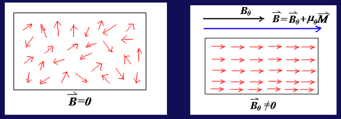 即使在没有外加磁场B的情况下,磁性材料中的磁偶极子(磁性小区域)也会倾向于在小范围内强烈地排列成特定的方向,形成所谓的“磁畴”。当施加外部磁场时,这些磁畴会重新排列,使得它们的方向一致,从而产生大的净磁化强度。