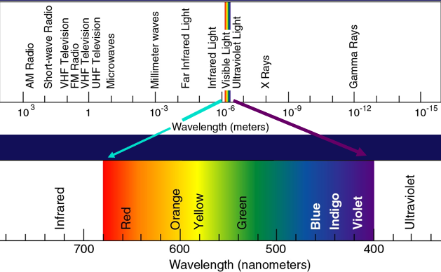 - 可见光波长与频率的关系:\(\lambda f=c\)