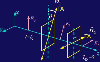 一束沿\(x\)方向的线偏振光,经过两个偏振片,第一个偏振片(TA方向)与\(x\)轴成\(\theta\)角,第二个偏振片与\(y\)轴平行,求\(\theta\)为多少时,第二个偏振片的透射光强最大。