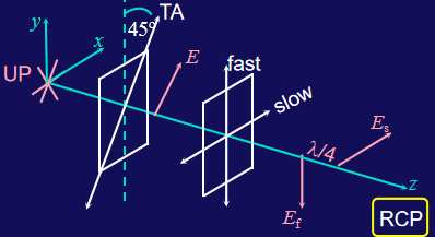 即慢轴不变,快轴变为\(\sin(kz-\omega t-\dfrac{\pi}{2})\),所以合成后出射的光为圆偏振光。为RCP,注意,快轴领先,所以它会先到达最大,所以是减去,在图上看来也是如此,从缝里出来后,先遇到了快轴的最大(\(-y\)方向上),然后才是慢轴的最大。