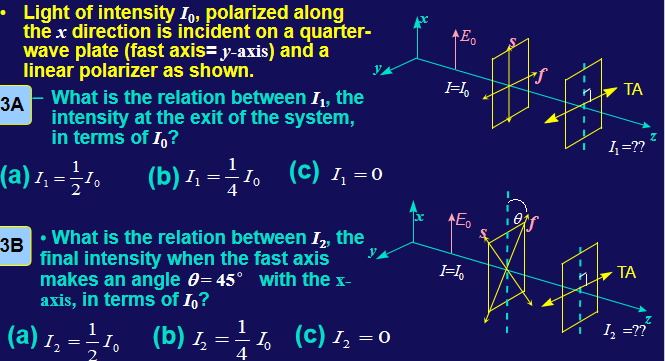 对于3B,第一次将振动方向分解为o光和e光的振动方向,由于是\(1/4\)波片,所以出射的光为圆偏振光,