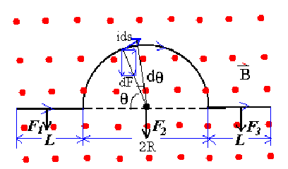 F_2 = F_\perp = \int_0^{\pi} iBR d\theta \sin \theta = iBR \int_0^{\pi} \sin \theta d\theta = 2iBR