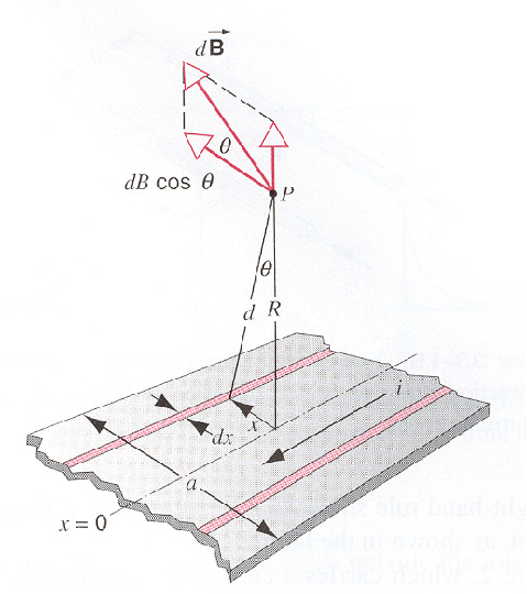 dB = \frac{\mu_0 di}{2\pi d} = \frac{\mu_0 \frac{i}{a} dx}{2\pi d}