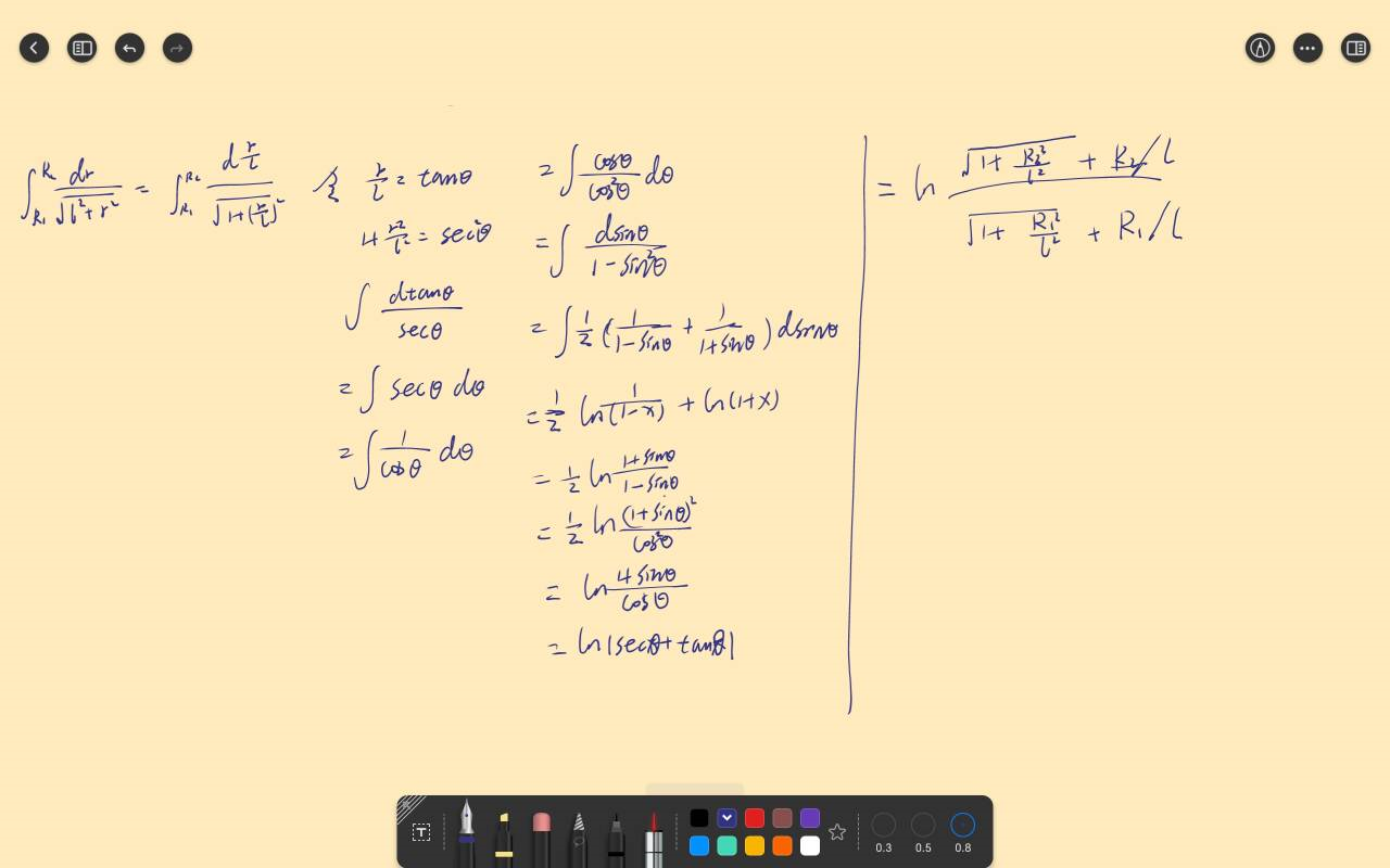 dB=\frac{\mu_0}{2} jdr \frac{2l}{\sqrt{l^2+r^2}} \quad B =\mu_0 j l \int_{R_1}^{R_2} \frac{dr}{\sqrt{r^2+l^2}}
